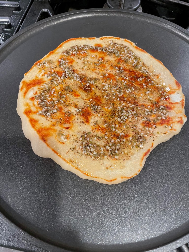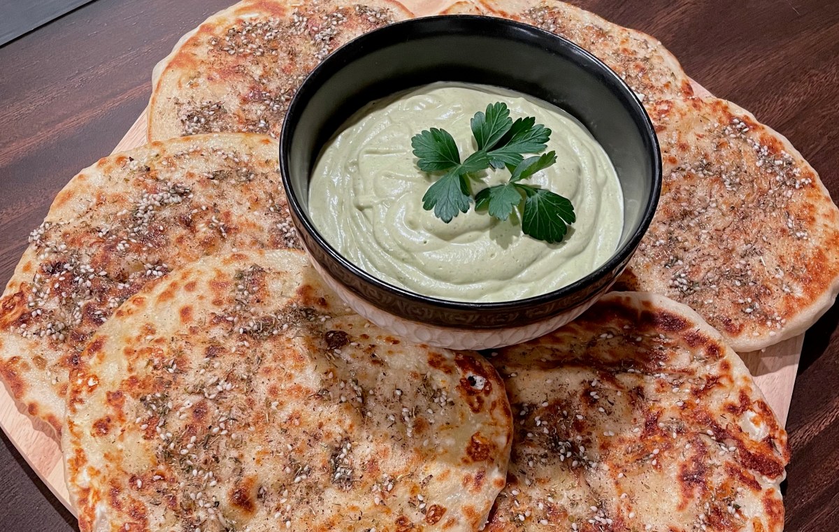 | Recipe: Feta Zaatar Flatbread with Charred Eggplant Dip | Special Equipment: Griddle, Stand Mixer |