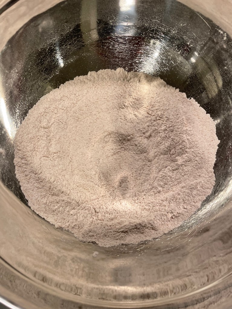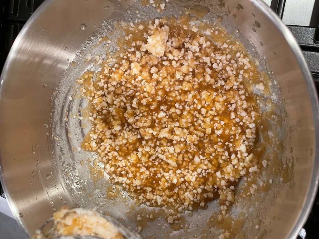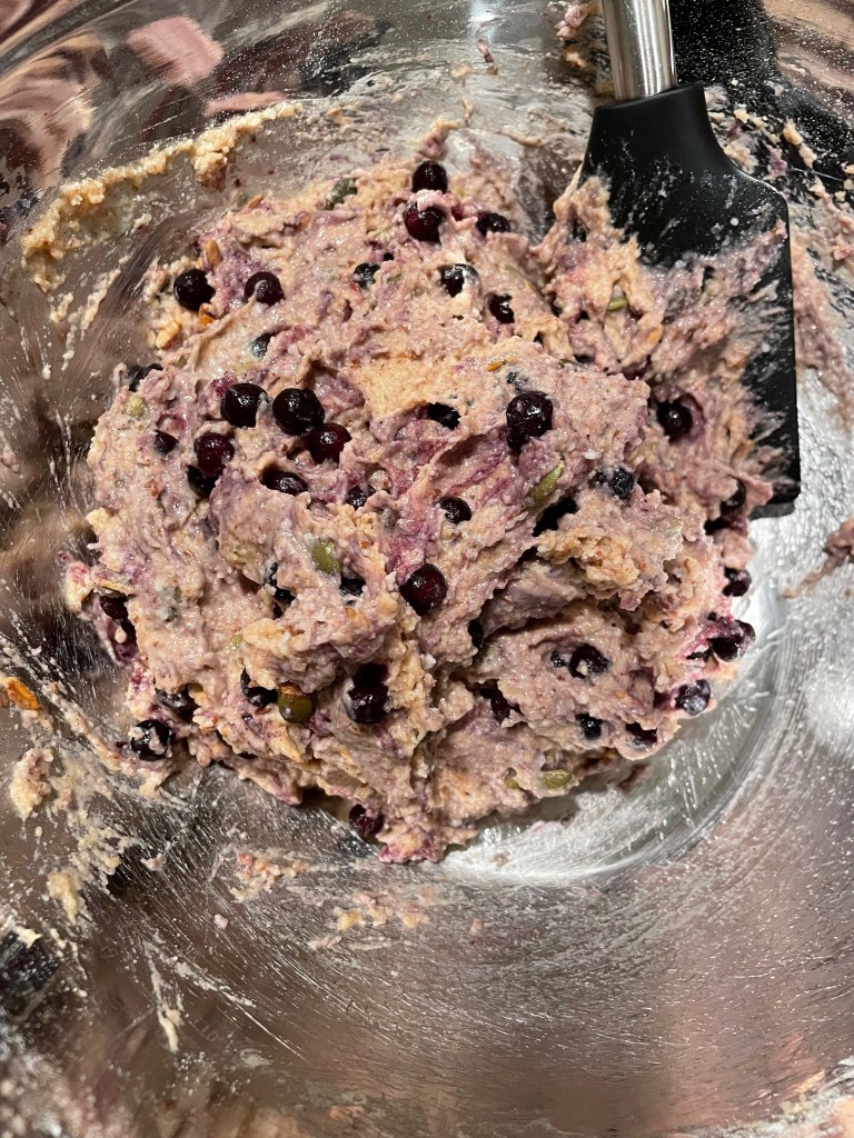 Tip: Be careful while making the wet portion of the recipe. As can be above if you mix in the wrong order and don’t work quickly enough the pieces of coconut oil will solidly into white chunks and render the batter slightly chunky. To avoid this do two things. First, liquefy/warm the oil completely and work quickly once it’s added. Second, make the wet portion in the following order while stirring continuously the entire time: “flax egg”, apple sauce, coconut oil, maple syrup, vanilla, brown sugar.