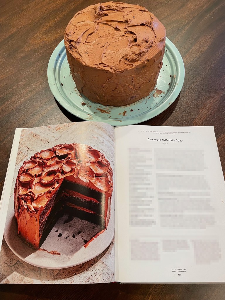 - Final Score: 4/5 – This is a great chocolate cake and fantastic frosting. The instructions (and video) for the frosting are particularly detailed and helpful. The entire cake can be completed within 3 hours, but you’ll be busy the entire time.