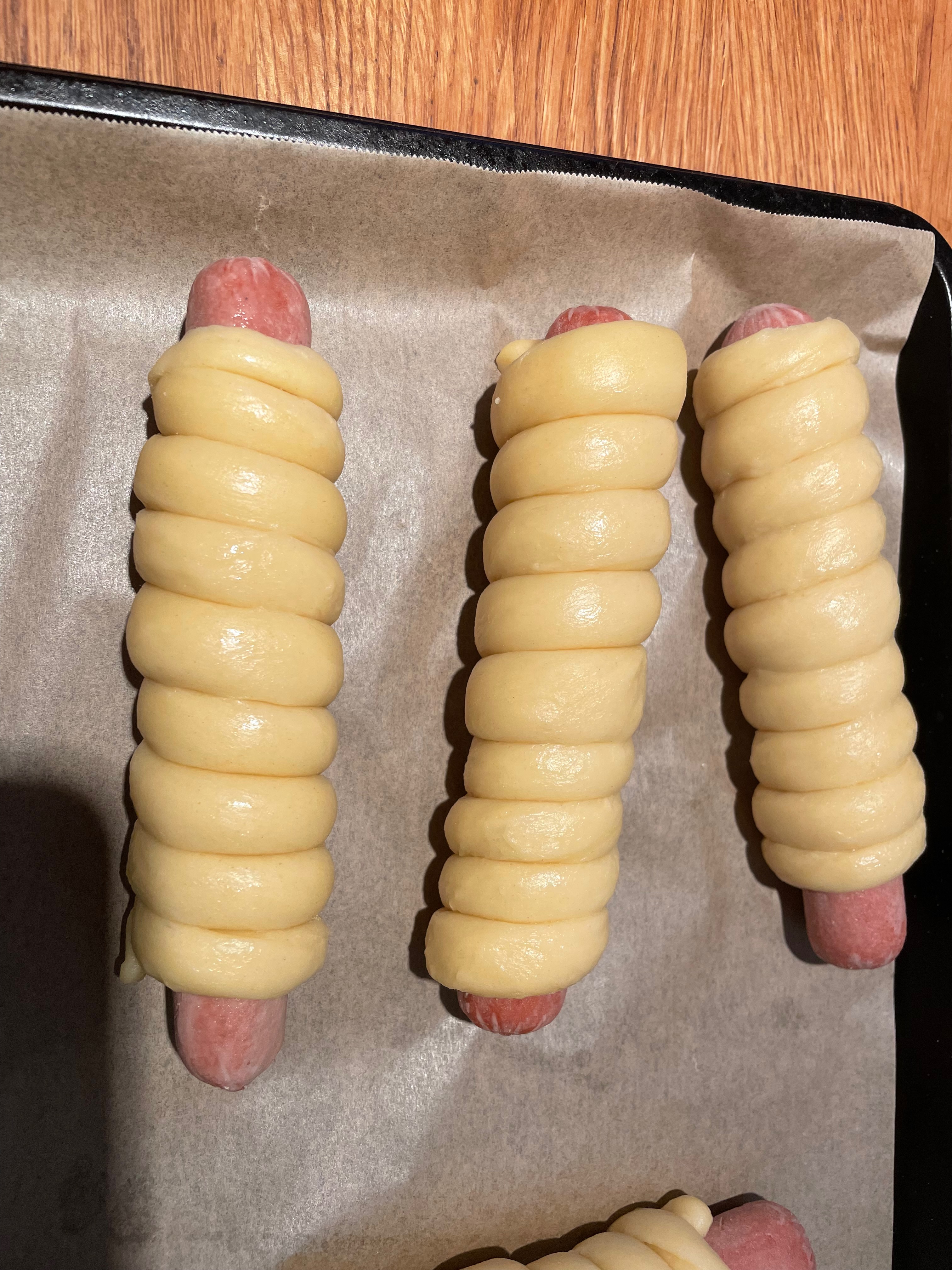 Tip 2: Consider pulling slightly on the dough while wrapping. Let the dough hang vertically over the middle of the hot dog as you roll to keep the other side sufficiently stretched due to gravity.
