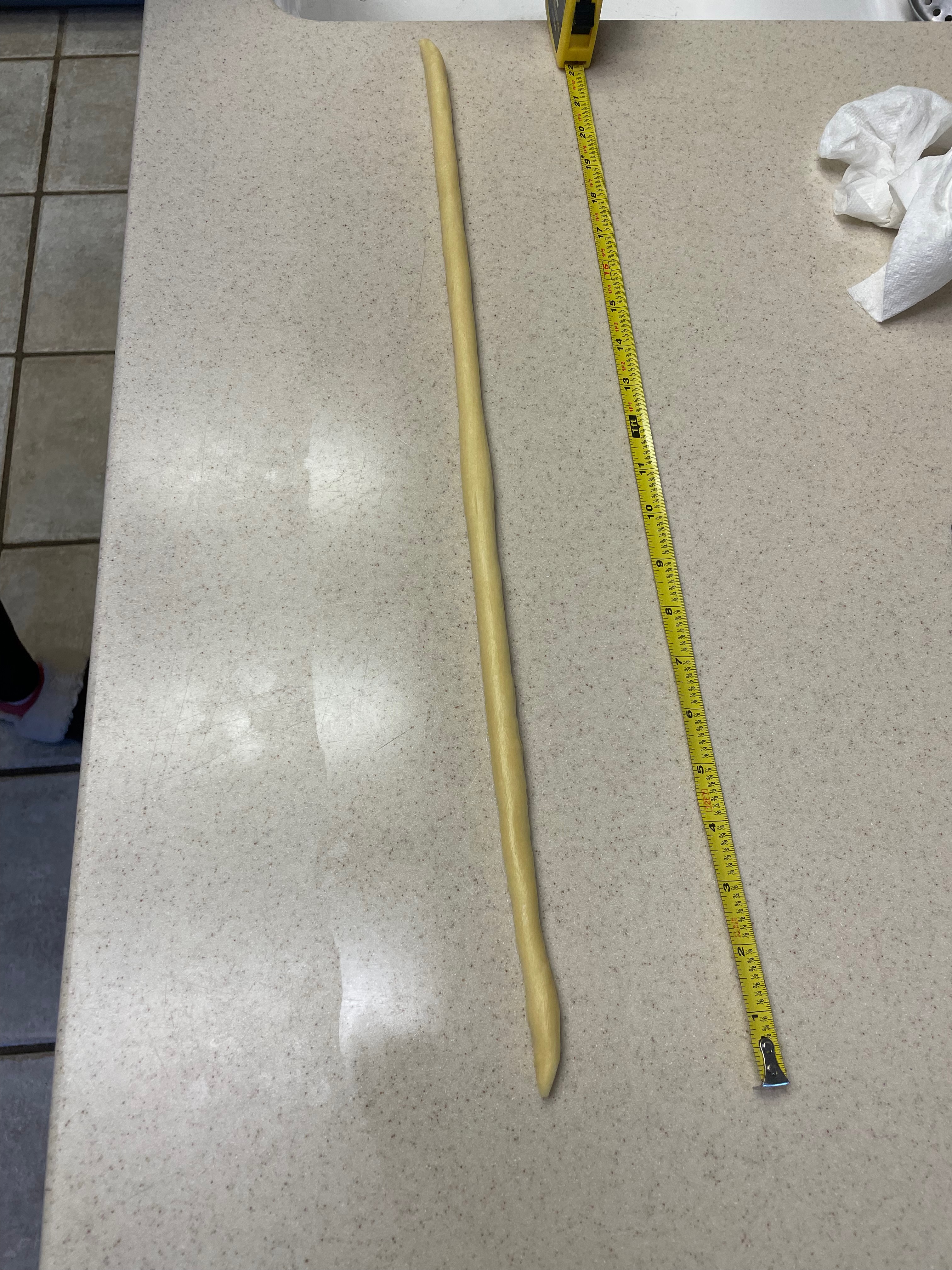 Tip 1: It’s not totally clear what the optimal dough roll to hot dog length ratio for full coverage should be so that the hot dog doesn’t stick out. Simply roll out the dough a bit longer (or shorter) to adjust after each one. Note that after you roll it out it will contract over the next minute or so.