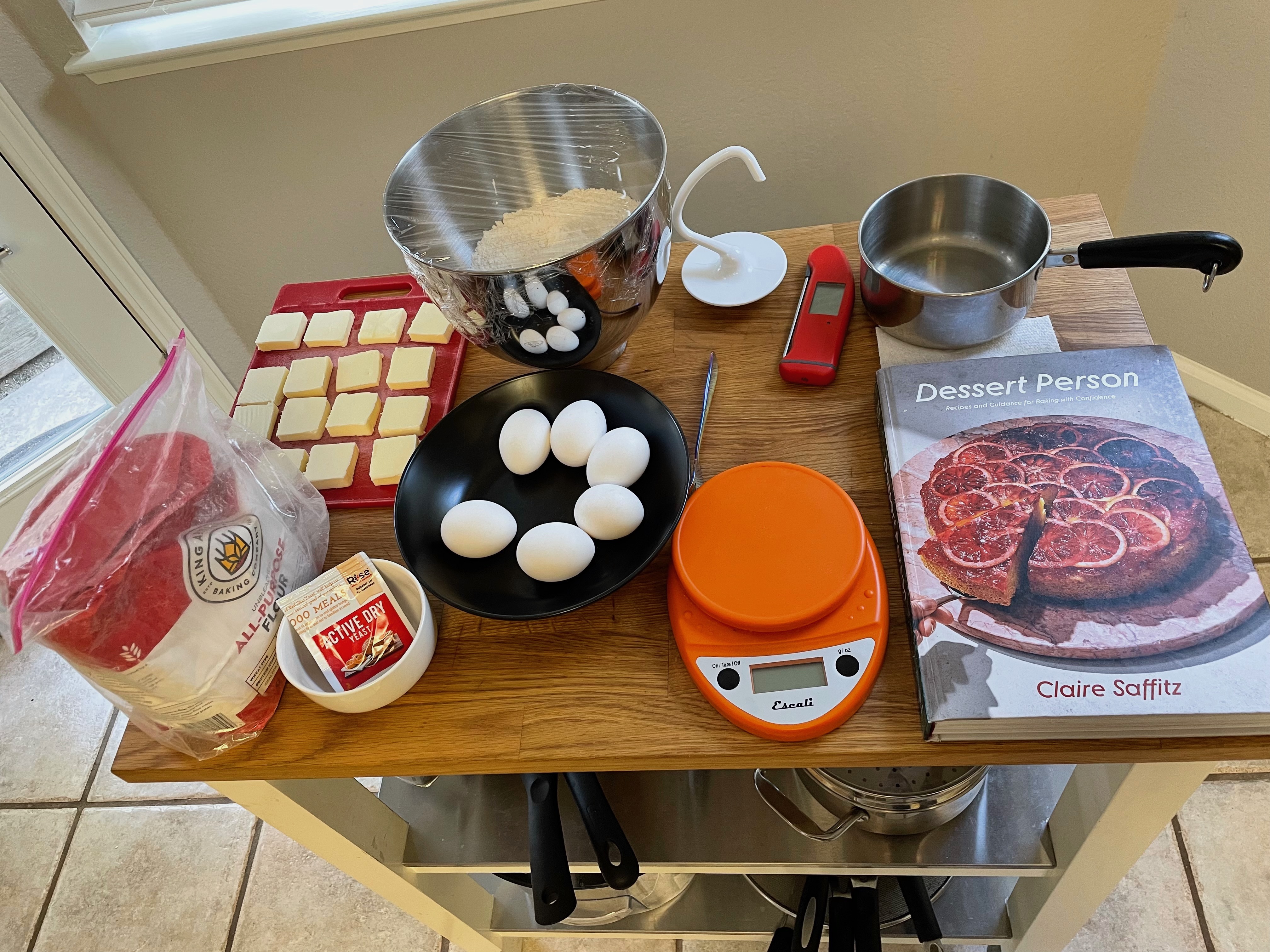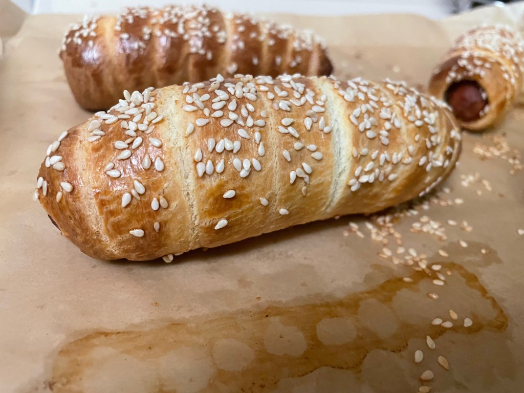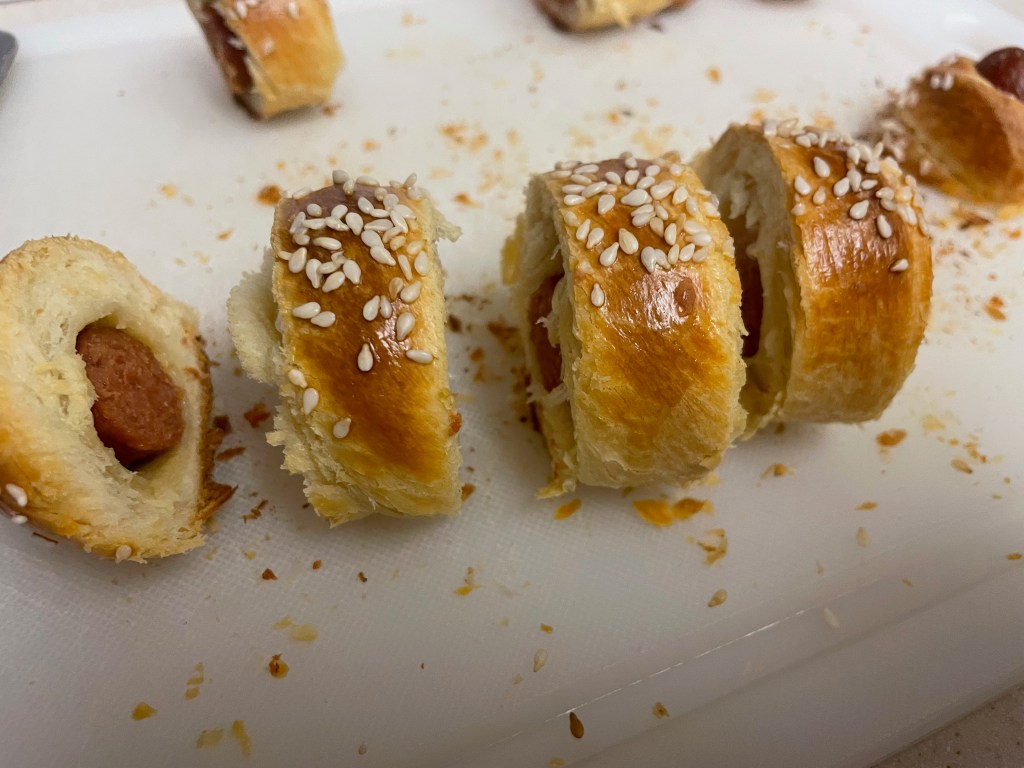 This recipe is mostly just making brioche and then working with it a bit. Nonetheless it’s a great recipe and a great way to make brioche and apply it in a fun way. Do note that brioche is a fairly complex dough that requires an (ideally) overnight period in the fridge. While the recipe came out great, we thought that Pigs in a Blanket was better with puff pastry. In fact we also made Pigs in a Blanket with Dessert Person’s rough puff pastry recipe and found it even better.