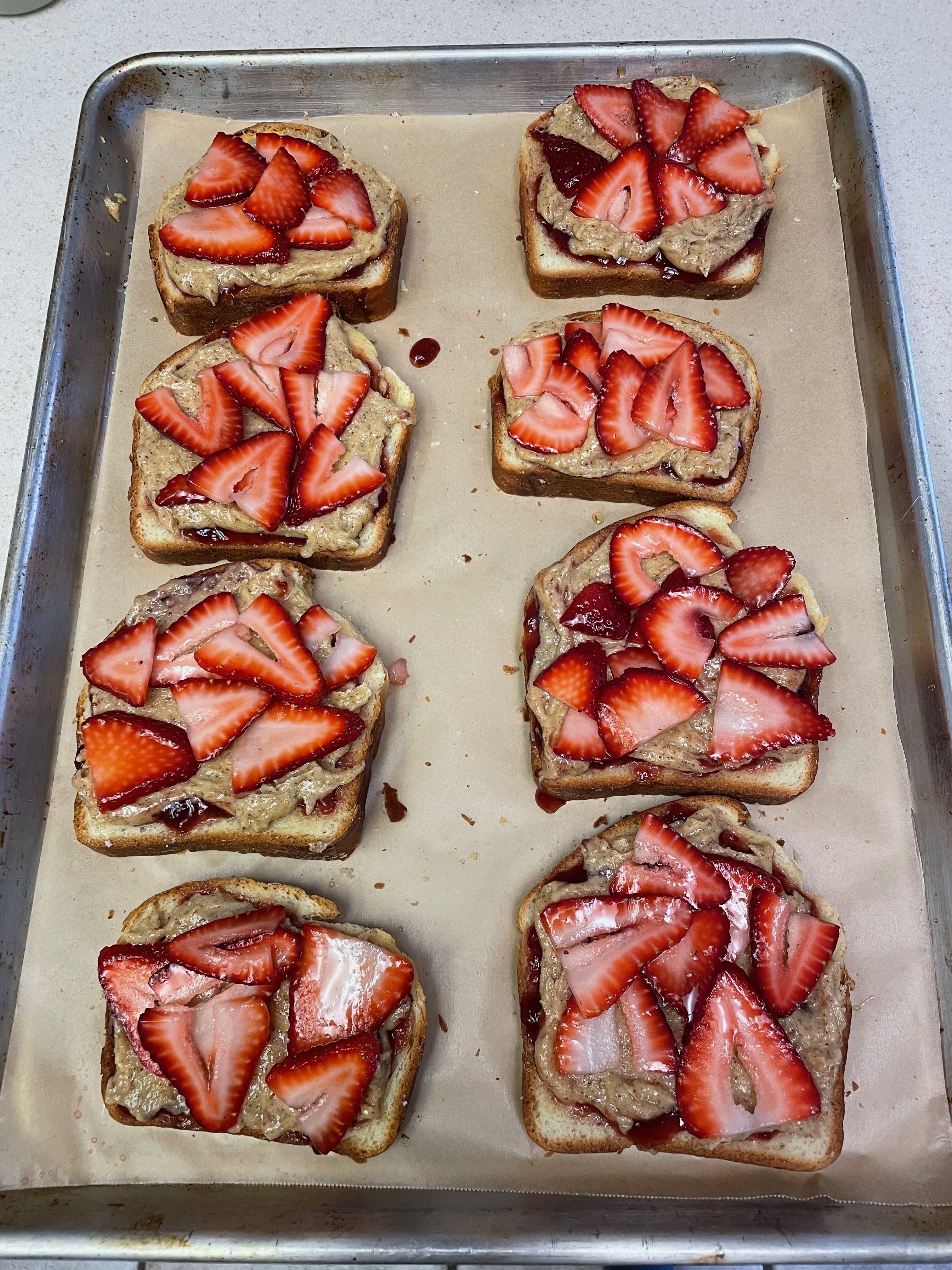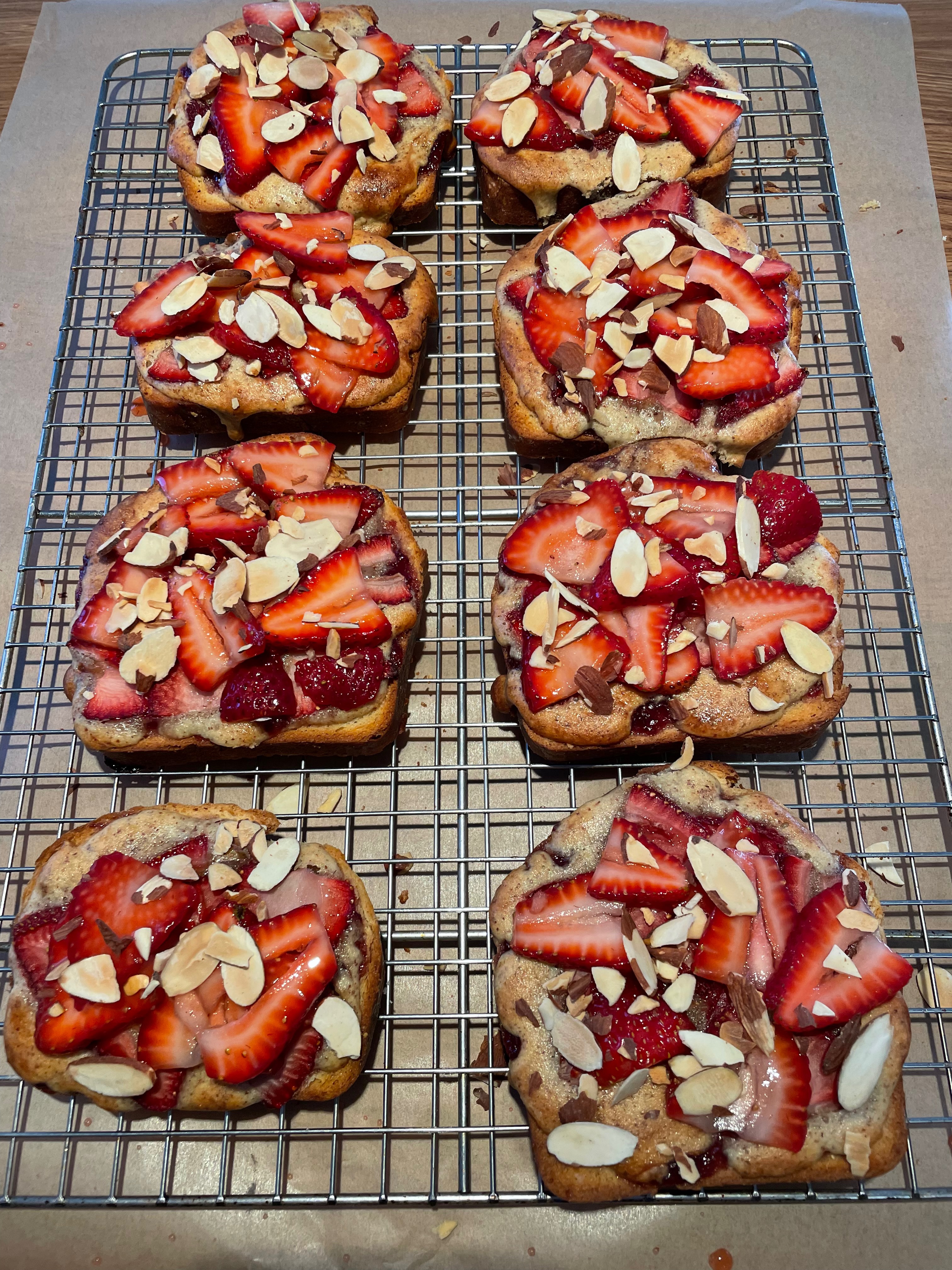 This is a great recipe if you ever get your hands on any particularly fresh, nice strawberries. Likewise, it’s a great reason to practice brioche as the rest of the recipe is fairly straightforward. The recipe has four main steps: brioche, frangipane, honey almond syrup, and assembly. The recipe can be done over multiple days so it’s great if you are busy or need to pace yourself. Definitely a fun recipe. It’s basically bourgeois peanut butter and jelly.