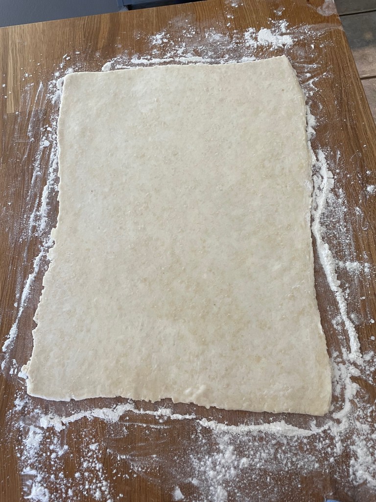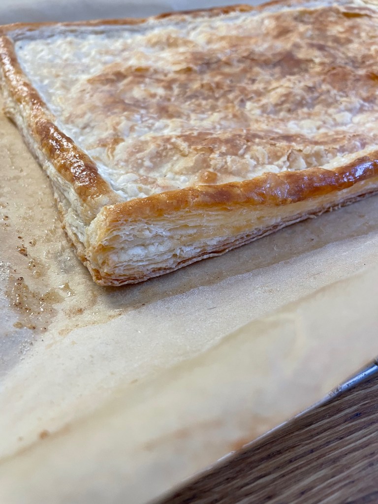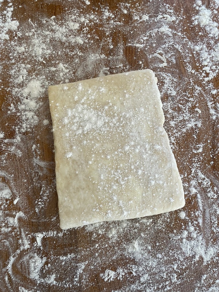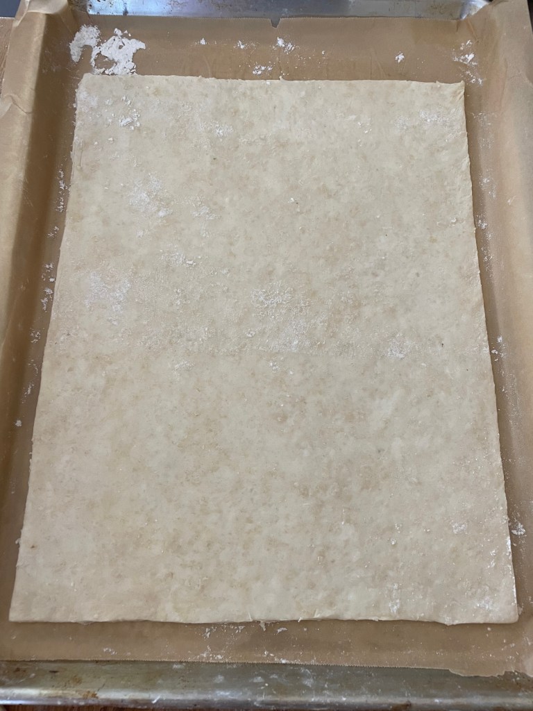 Tip 3: It can be hard to roll out the puff pastry after the first refrigeration as it tends to be loose and break apart. You can help combat this by rolling the dough out in small sections, going rapidly back and forth over each small section before moving onto the next section. That is, roll back and forth over a 3-4 inch segment of the dough, before moving to the next 3-4 inch segment. This helps compact and tighten the dough, preventing it from breaking apart. If you do long rolls across the entire dough it’s more prone to break apart due to how the stress is applied.
