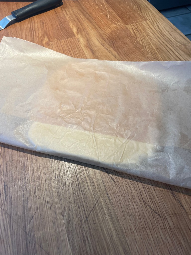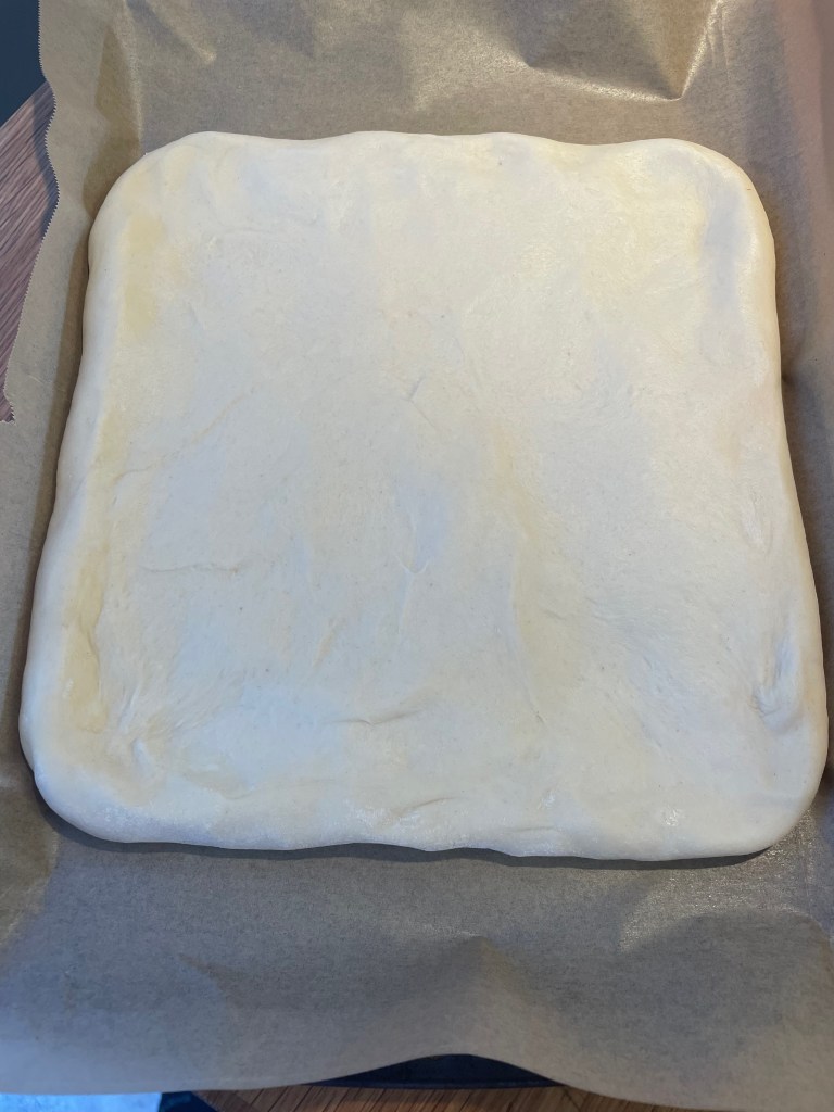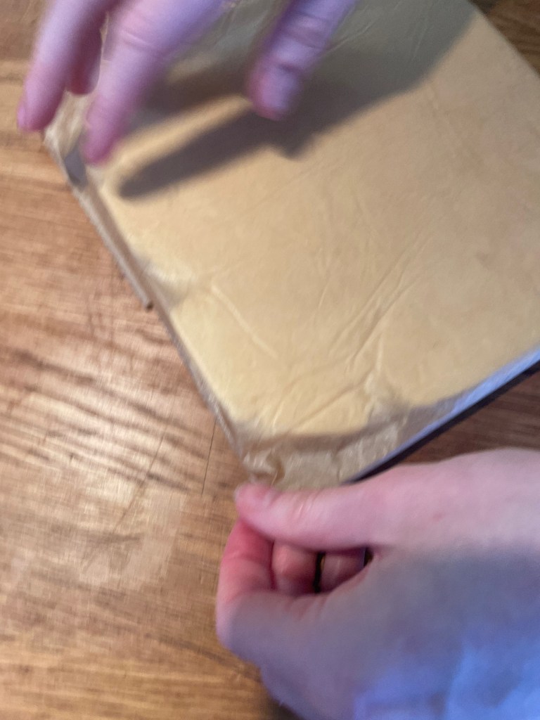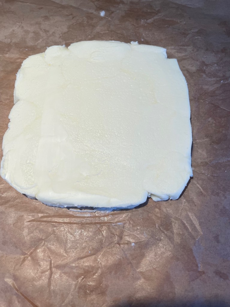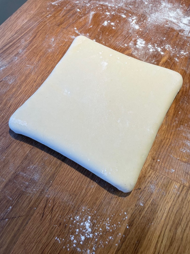 Tip: First get the butter into a rough square and then create a package with the parchment paper (tape to seal and flip over). To get it into a perfect square, simply hold one corner and roll into the opposite corner using the rolling pin.
