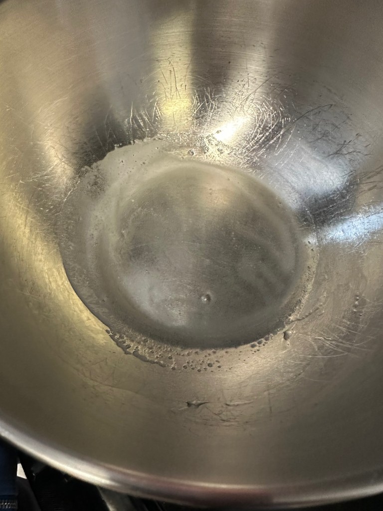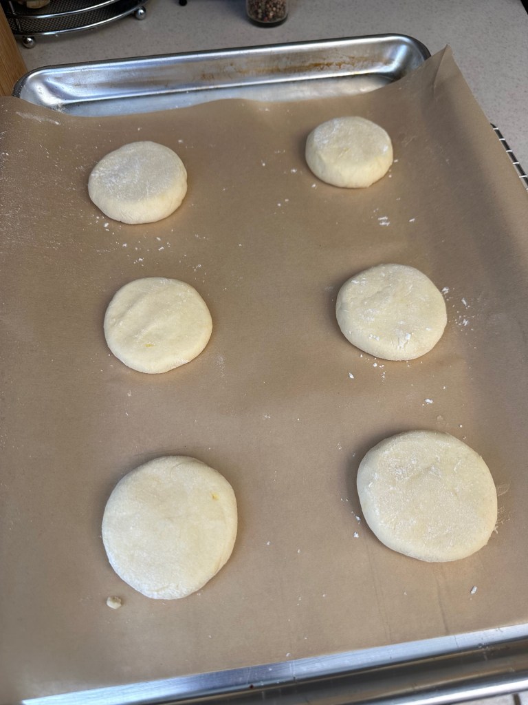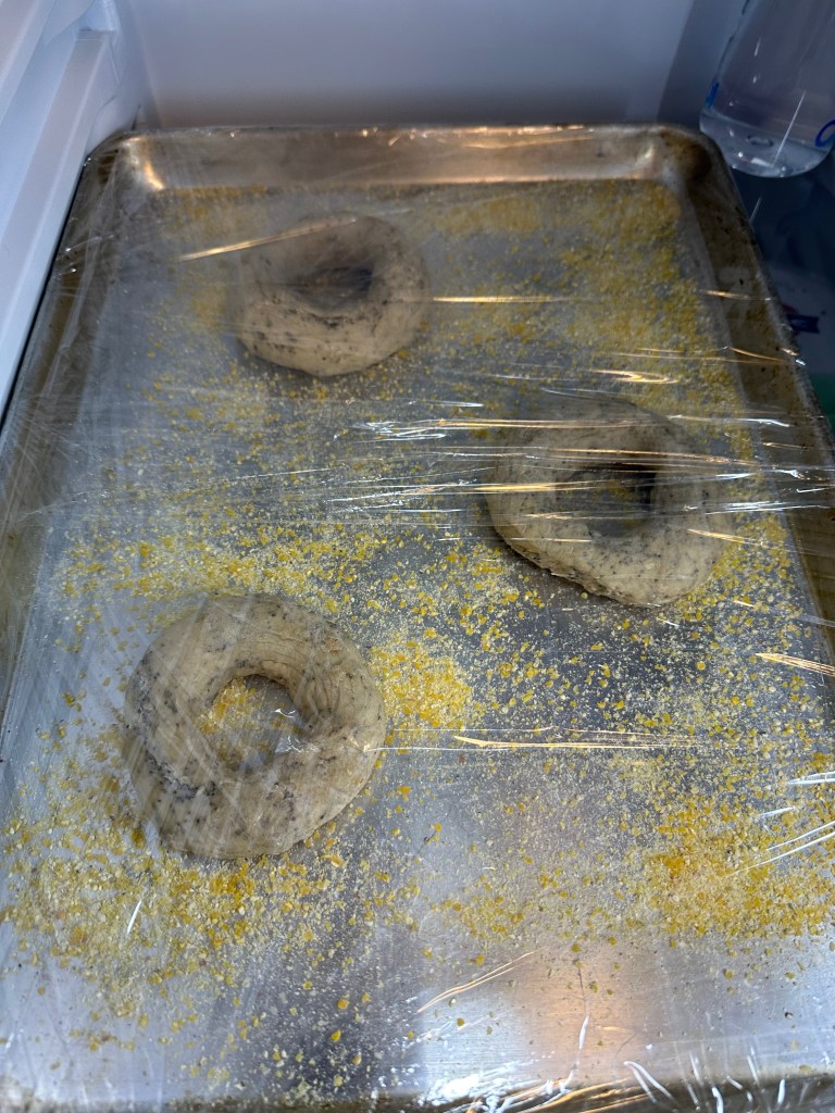 Tip: Use fine cornmeal to line the tray for baking. Likewise only apply cornmeal to where the bagels will actually sit – otherwise it will burn/smoke in the oven.