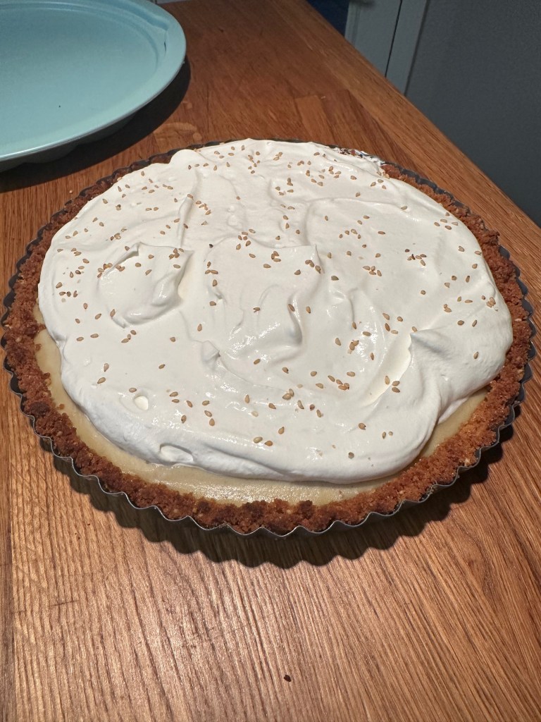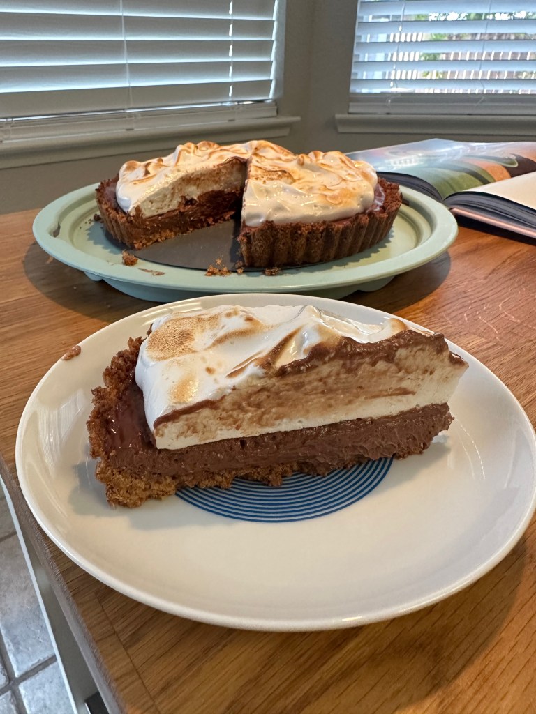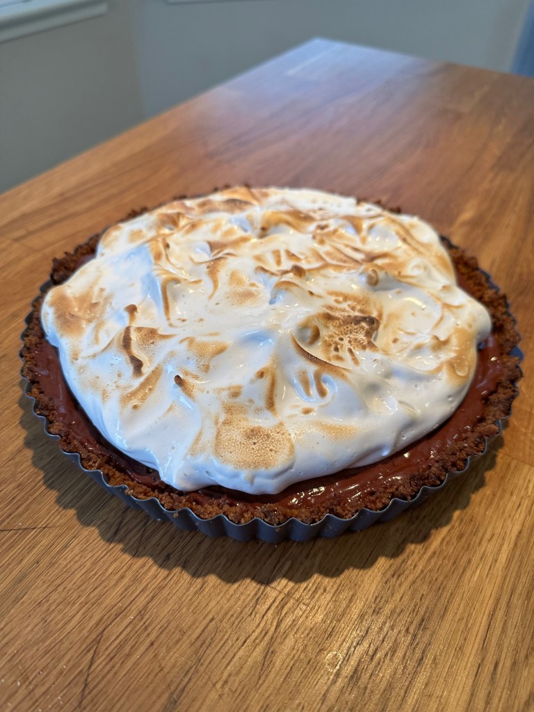 This is a great recipe that combines a variety of techniques to produce a classic and delicious tart. The recipe is an easy intro to tart crusts, marshmallow, and chocolate ganache. This is one of the best so far from What’s for Dessert, but a tad more difficult than most.