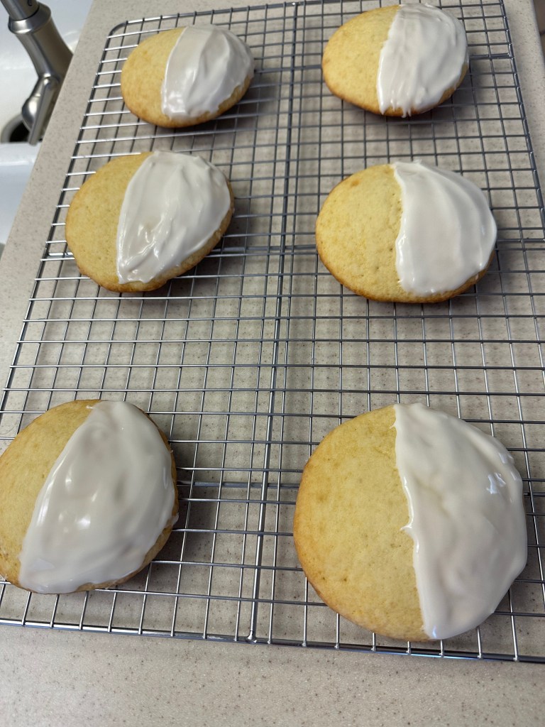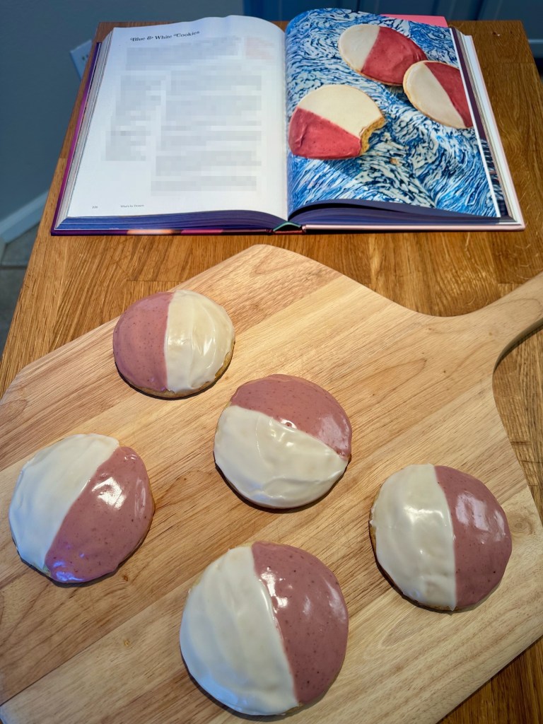 A blue and white cookie really does make more sense than a black and white cookie when you consider the flavors. This recipe does a great job of showing that. The blueberry icing and the lemony, plain icing making for a great combination. Definitely give it a try.