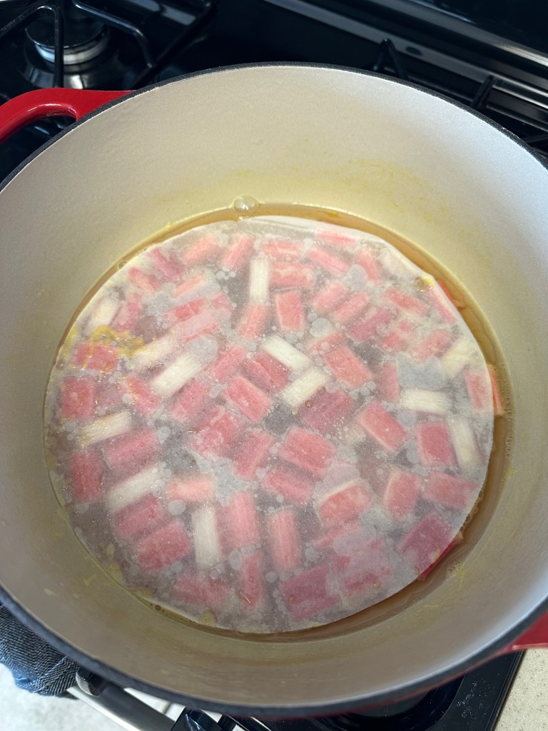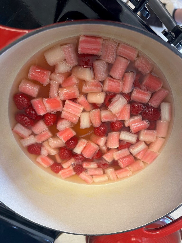Tip: Be careful to not over-poach the rhubarb. Keep a close eye on by occasionally poking/touching a piece of rhubarb. Remove it immediately from the heat at the point of simmer.